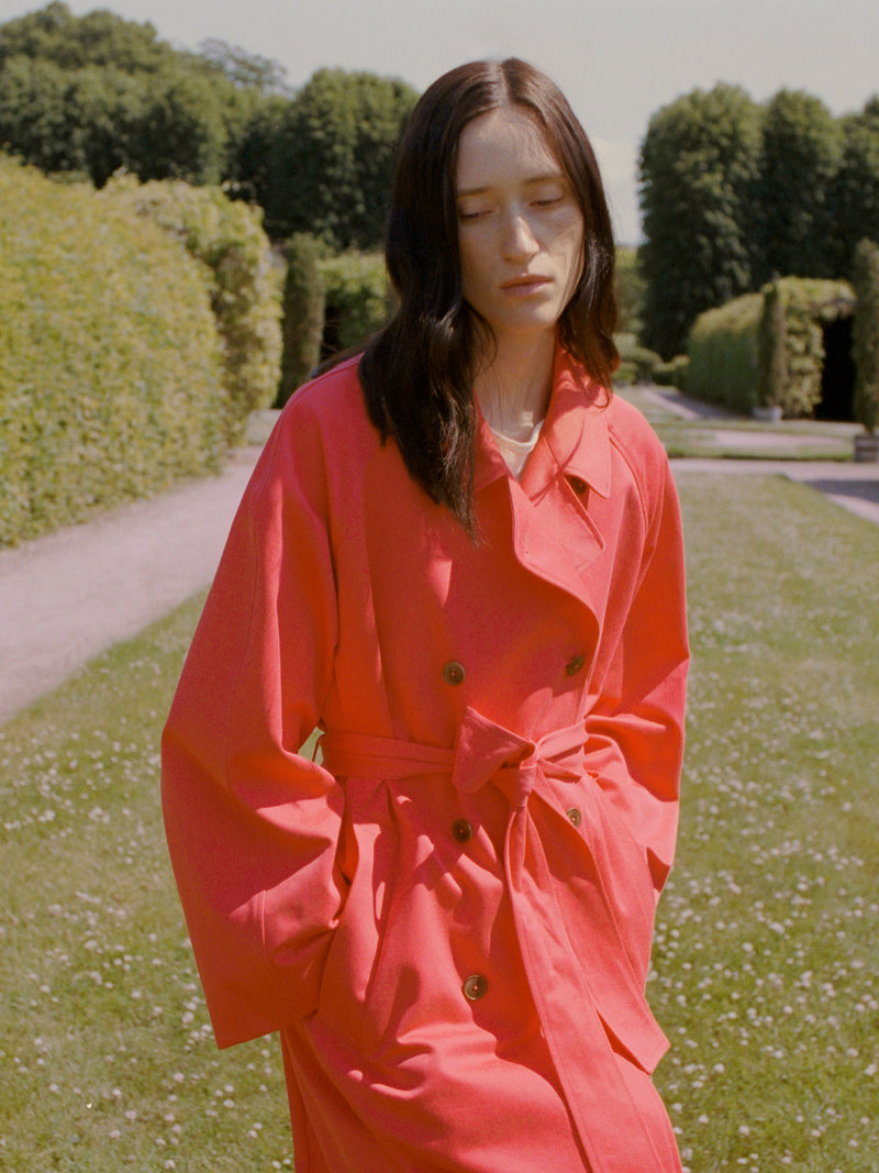 Et strejf af sol - ny oversize trenchcoat i rød med fine klassiske detaljer. Shop The Spring Coat