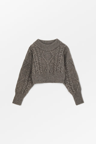 Cropped kabelstrik med dyb rund hals, sænkede skuldre og brede ribkanter.