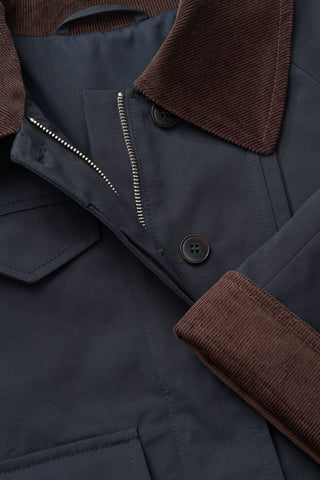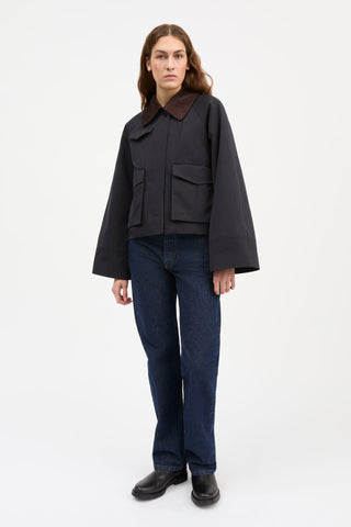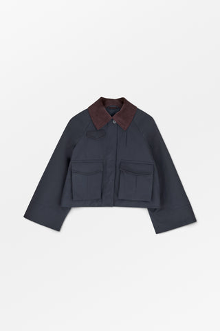 Kort jakke med krave, raglanærmer og flere funktionelle lommer.