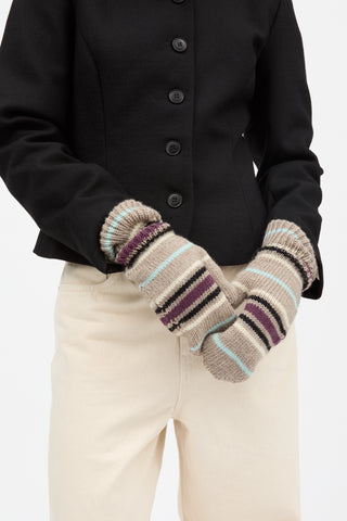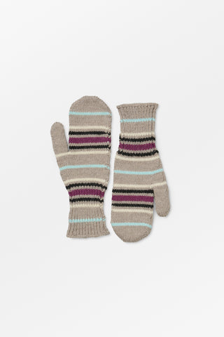 Laura Mittens er strikket i 100% merinould med et farverigt stribet mønster. Vanterne er glatstrikkede med ribkant ved håndleddene for en tæt og behagelig pasform.