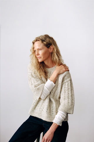 Vores idé med Laurine var at lave en forårsstrik med korte ærmer og et mere feminint og let udtryk, end vores andre strik har. Mønstret pointelle danner små huller. Man kan kigge igennem og dermed lege med, hvad man har på indenunder. Vi elsker at klæde os i strik året rundt, men en Magda med høj hals og tunge kabelmønstre er måske ikke den, du tager på en sommer aften. Der er Laurine et bedre bud.