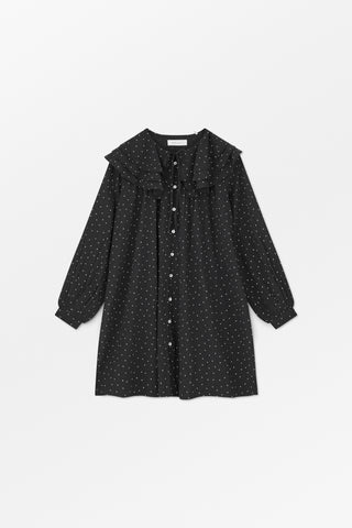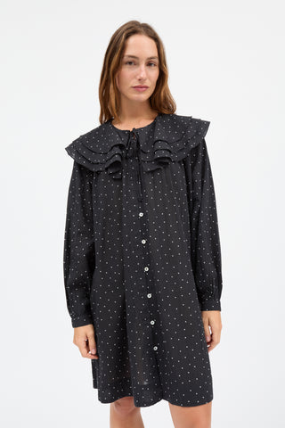 Lilou Dress er en løstsiddende kjole med let vidde, der går til lige over knæet og er en anelse længere bagpå. Den store krave består af tre lag flæser, der breder sig elegant ud over skuldrene, mens de voluminøse ærmer fuldender silhuetten. Kjolen er fremstillet i 100% økologisk bomuld og lukkes foran med knapper og et bindebånd i samme stof ved halsen.