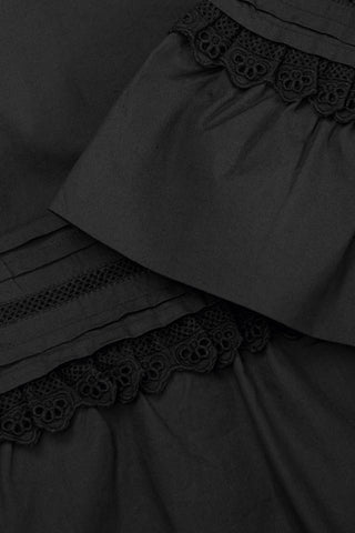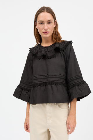 Lulu Blouse er en feminin, løstsiddende top med en stor, flæset krave pyntet med blondekant. Blondebånd og fine læg løber omkring taljen og ærmerne, som afsluttes med en rynket flæse. Blusen er fremstillet af 100% økologisk bomuld.
