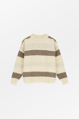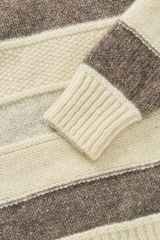 Olga Knit har et smukt stribet mønster, en let boxy pasform og er inspireret af 1970’ernes farver og håndværkstraditioner. Hver stribe er strikket i en ny teknik – nogle i ret, andre i vrang, perlestrik og rib – hvilket giver et levende og håndlavet udtryk. Striberne er vores fortolkning af 70’ernes patchwork, men i lyse og feminine nuancer, der giver et moderne og tidløst udtryk.
