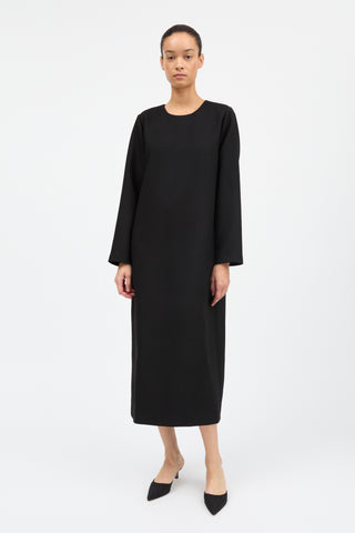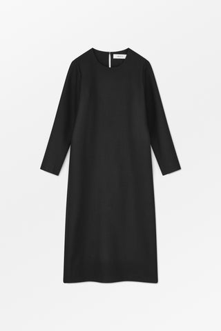 Rosie Dress er en lige, langærmet kjole med enkel rund hals, der går til midt på læggen. Kjolen er enkel og elegant, fremstillet i 100% uld og foret i overdelen for et raffineret finish.