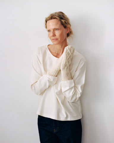 Vi cykler meget her i København, derfor er det dejligt med et par gode luffer i kabelstrik. Her er uld et godt materiale: Det er dejligt at have på, det varmer, man får automatisk lidt gennemtræk, og så ser det smart ud. Lufferne kunne, rent strikkemæssigt, være et sted at begynde. De er mindre og dermed mindre tidskrævende end en stor trøje, der kan tage flere måneder, men gør brug af lige så komplicerede teknikker som vores andre designs, blot i mindre skala.
