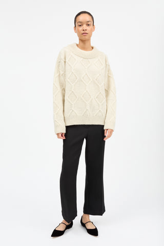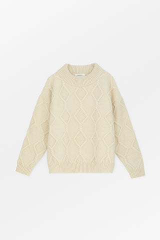 Skagen Jumper er en kabelstrik sweater i 100% uld. Den har en dyb rund hals med dobbeltlags ribkant. Brede ribkanter afslutter ærmer og bund. Sweateren har en løs pasform med sænkede skuldre.