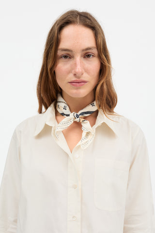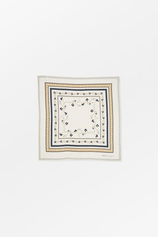 Skall Floral Scarf er et lille tørklæde i 100% bomuld med et mønster af fine blomster indrammet af en kvadratisk bort. Det er den perfekte afslutning på et outfit, når det bindes om halsen.