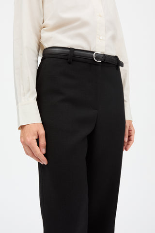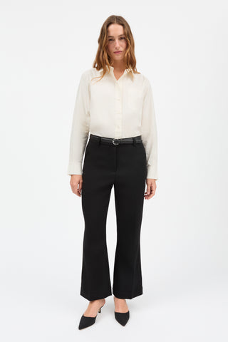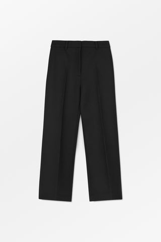 Wallace Trousers er et klassisk par bukser med lav talje, smalle hofter og let vidde ved anklerne. De lukkes med lynlås og dobbelt hægte og har skrålommer i siden samt en lomme bagpå. Bæltestropper og pressefolder foran fuldender det elegante udtryk.